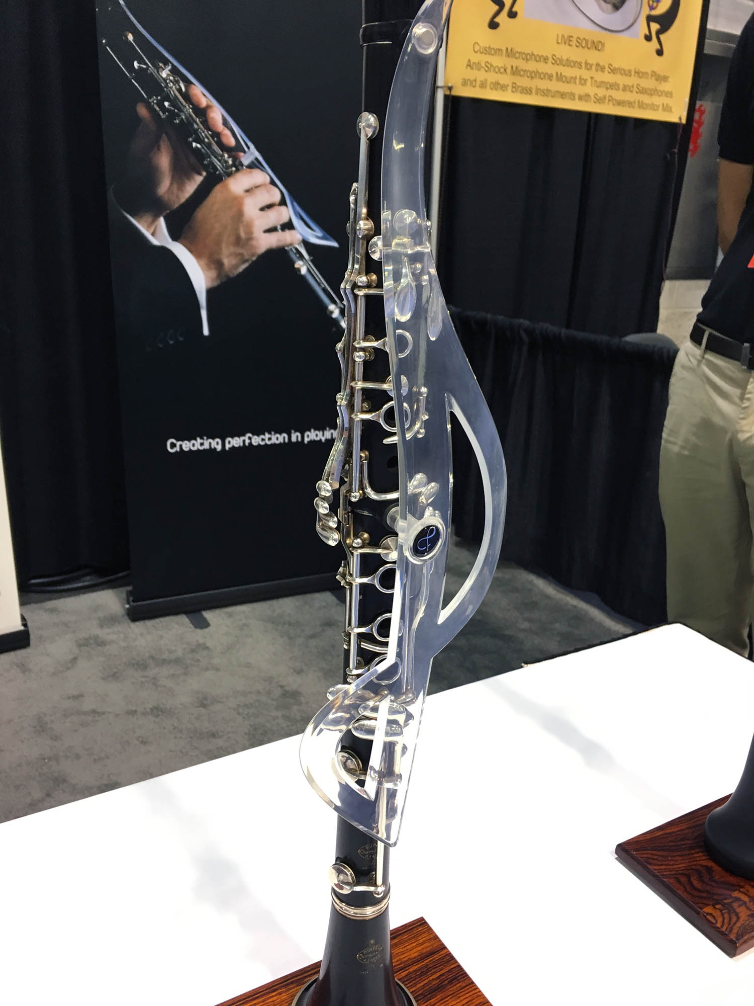 | This strange device is a plastic guard that fits onto a clarinet. It attaches with rubber rings at the joints in the sintrument. The guard can then be taken on and off very easily. It is for clarinet students so that they learn not to lift their fingers far from the keys while playing. |