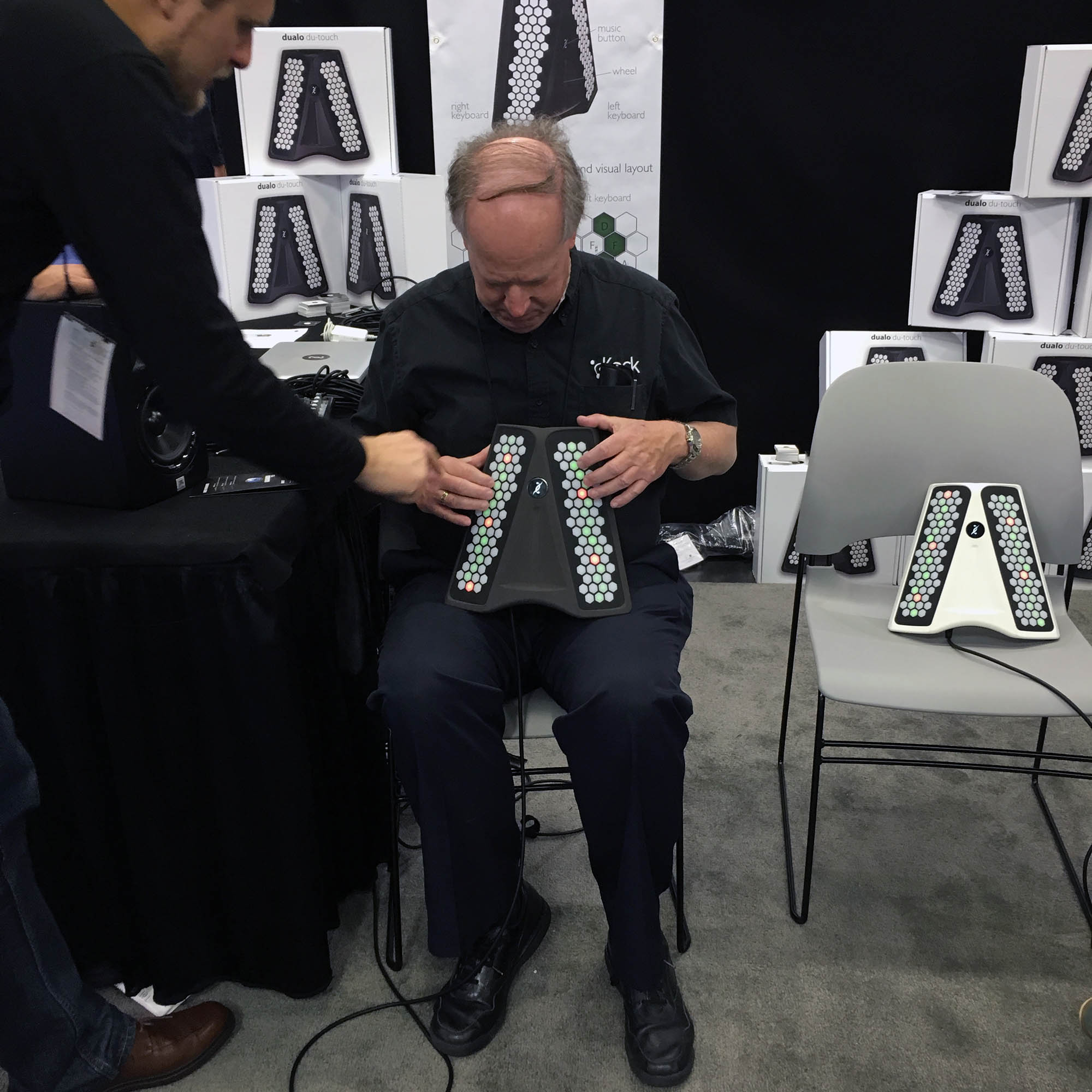 | In the category of strange new MIDI controllers (and a whole lot more, according to the salesman), here is the Du-Touch. Though it looks somewhat like a concertina keyboard, it is not. The buttons are in a slightly different configuration - and they can be reprogrammed. The base mode is set so that three consecutive keys play a major (or minor) triad. I found it somewhat confusing at first, but I was able to play a bit with it in only few minutes of experimentation. |