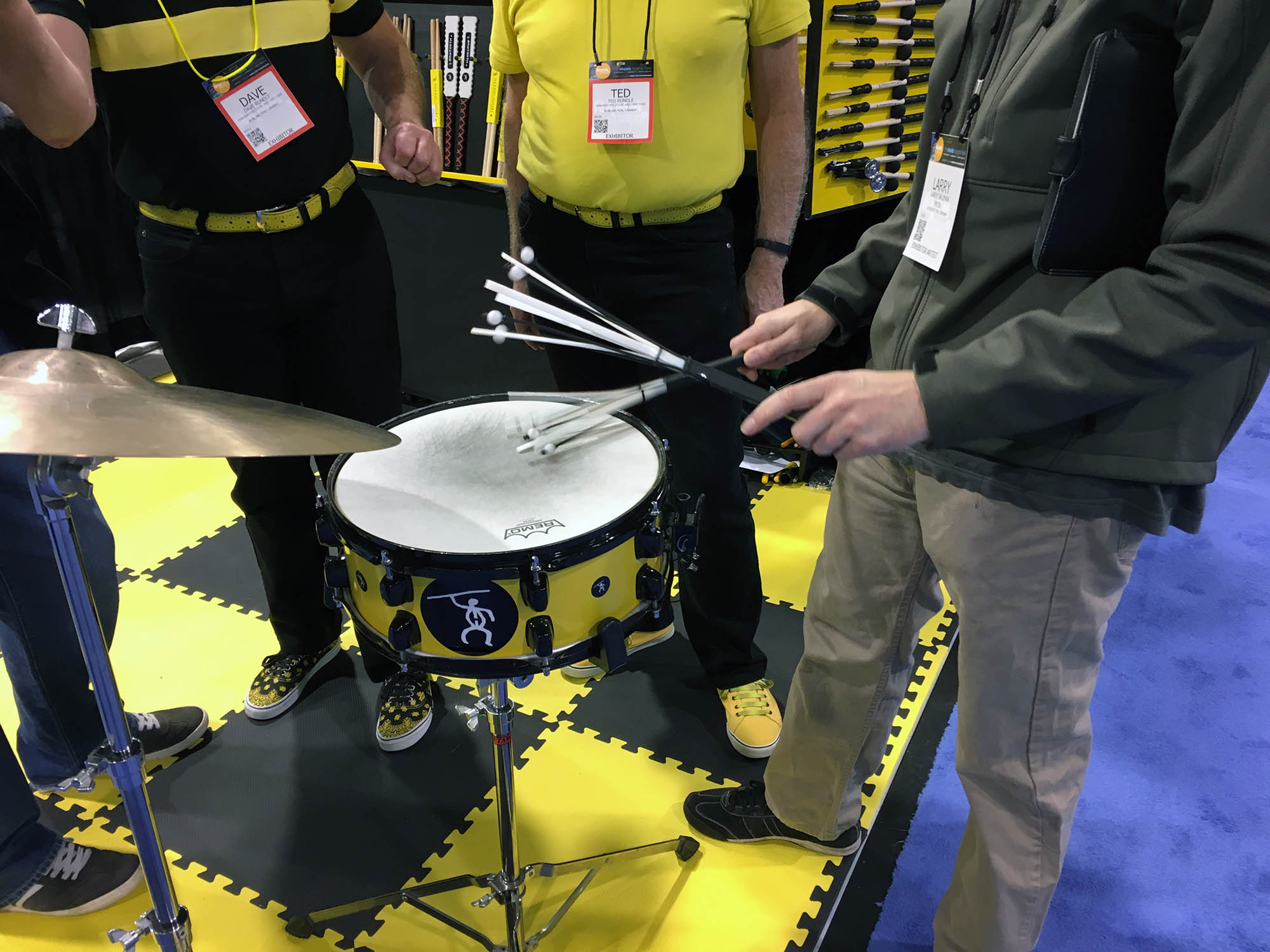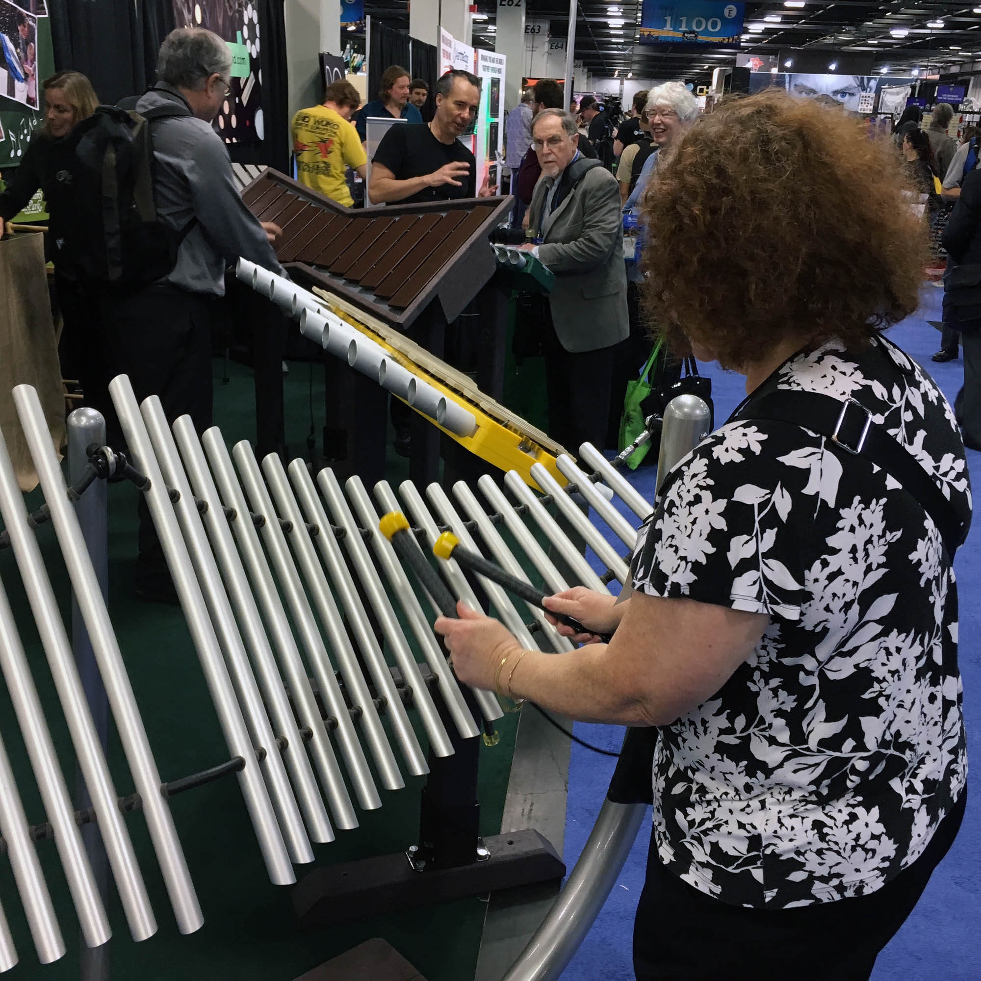 | This booth really catches your eye at the show. It is a display of percussion instruments from Freenotes Harmony Park. The odd thing is that their marimbas, chimes, congas, and xylophones are not arranged according to an traditional scale. Instead, they are grouped to make an artistic statement. The instrument being played by Karen here is arranged in an inverse pipe organ chest configuration with consecutive chromatic notes far from each other. I asked one of the exhibitors about this. She told me that most people "get the idea" pretty quickly and are quickly playing songs. I suggested that this might not be the case for musicians! |