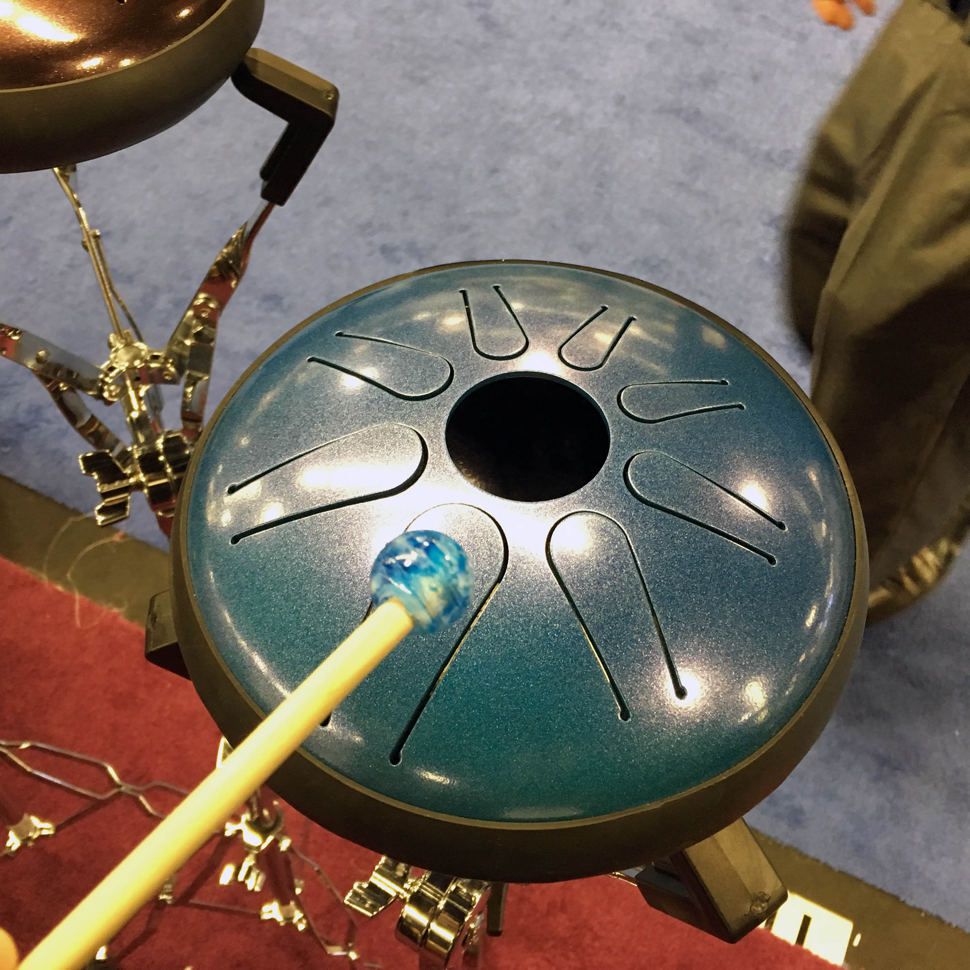 | I have noticed an increasing number of new instruments based on the steel drum paradigm. They are metal with regions you strike with mallets that produce different pitches. This new one from Idiopan is unique. At first glance, its distinct feature is the circular tone hole in the center. However - there is more to this than is visible. If you reach inside the hole, you can move magnets on each tone region to tune it over the range of about a half octave! This means you can retune the instrument to play different scales or chords. |