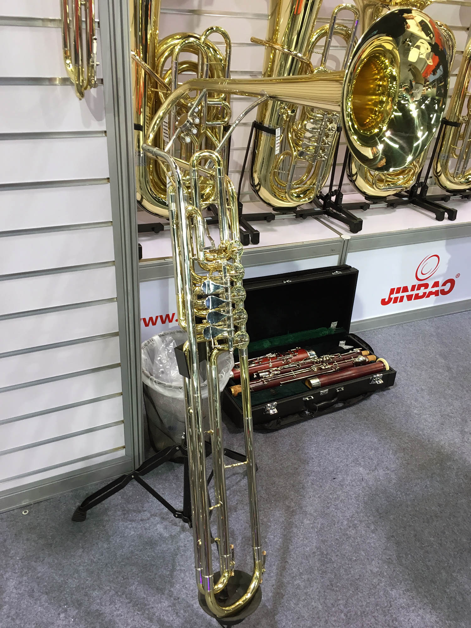 | Jinboa always has something interesting - and I have bought things here several times in the past. This thing doesn't have a name as far as I can tell. The woman at the booth didn't tell me what it was called - only its price! It is what I would call a contrabass valve trombone. I was able to play it with my tuba mouthpiece. |
