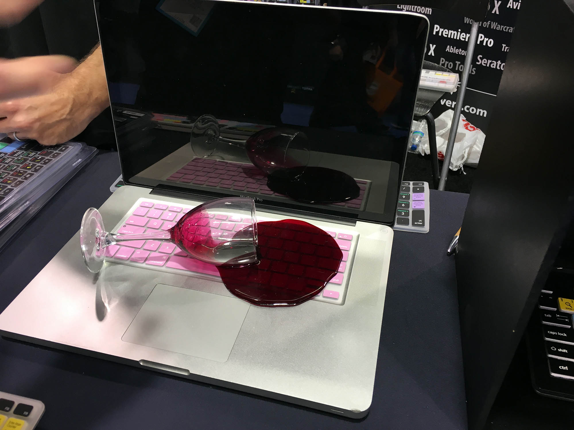| KB Covers sells protective plastic overlays for Apple keyboards. This eye-catching display tells it all! For NAMM, they had a whole line of keyboard overlays designed for use with various studio software products. |