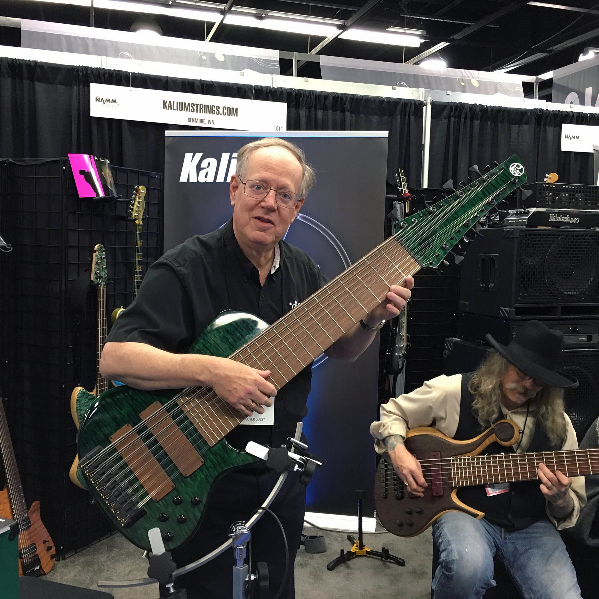 | This is a 24-string electric bass. However, the company running the booth, Kalium, does not make instruments - they make the strings. This was a novel way to show off the wide range of bass strings they manufacture. The bass DOES play though! It plays very well - though it is so heavy that it is usually mounted on a stand. |