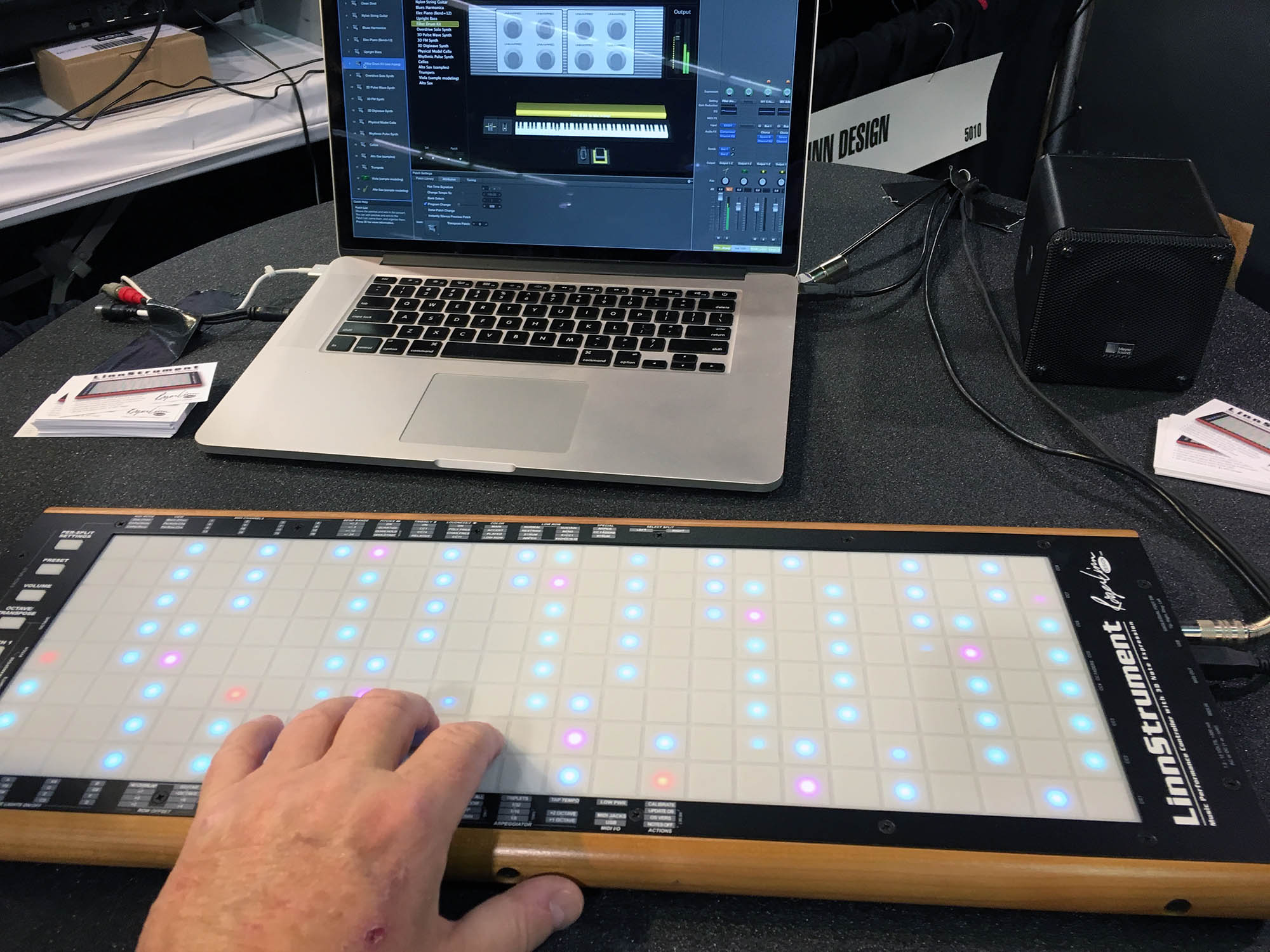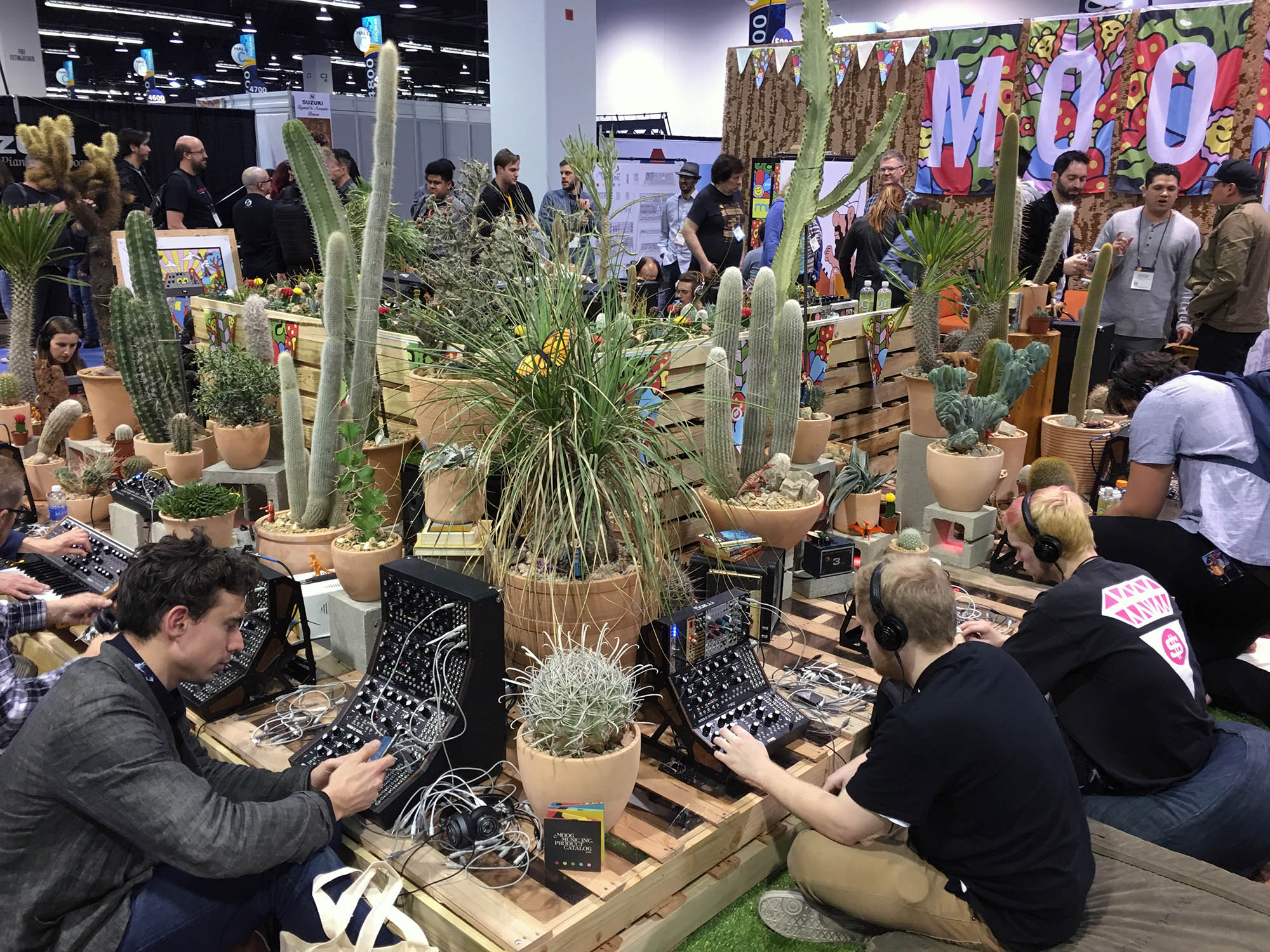 | Moog had an exhibit that was, perhaps, inspired by the California drought. It was a cactus garden. The plants are real. The hardest thing was that you had to sit on the floor to try their instruments! |