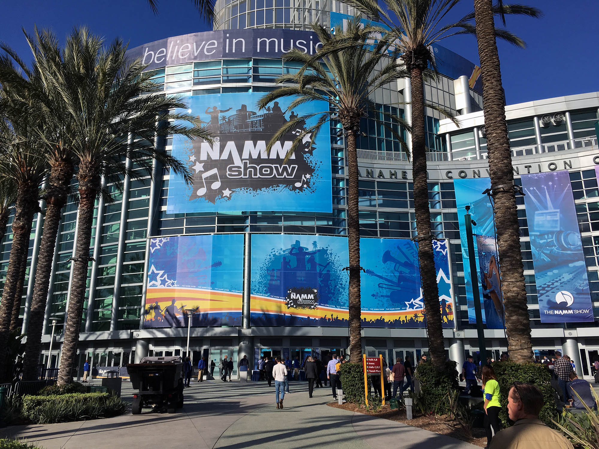 | Here is the view at the main entrance. Once again, we had fundamentalist Christians demonstrating here. They held signs implying that we NAMM show attendees were sinners in need of saving. I think these are the same people who precede the Tournament of Roses Parade on New year's Day in Pasadena. |