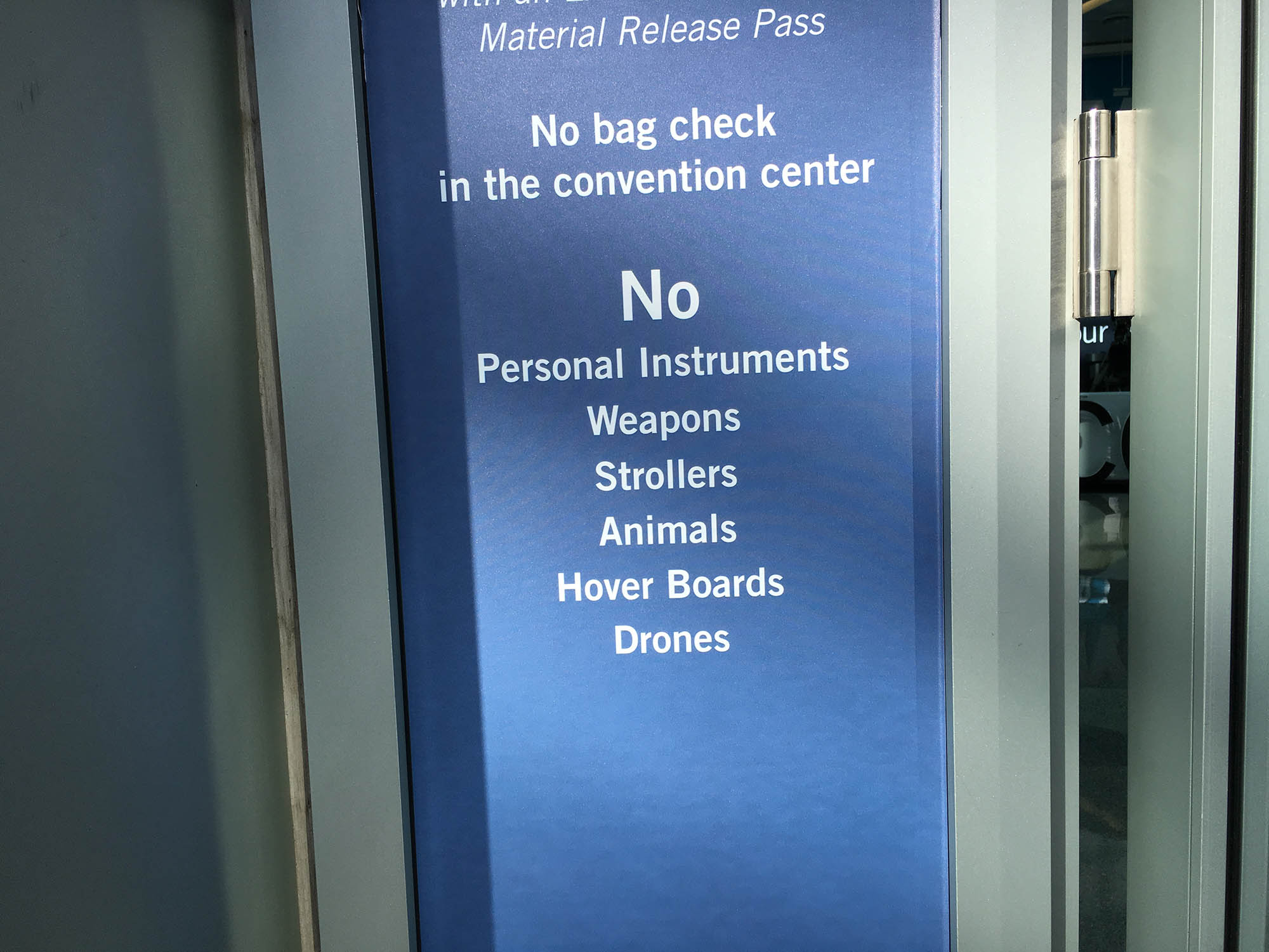 | As a sign (pun intended) of changing times, there are some new disallowed items this year at NAMM: hover boards and drones. Indeed, I did not see any of these inside - even in exhibits. |