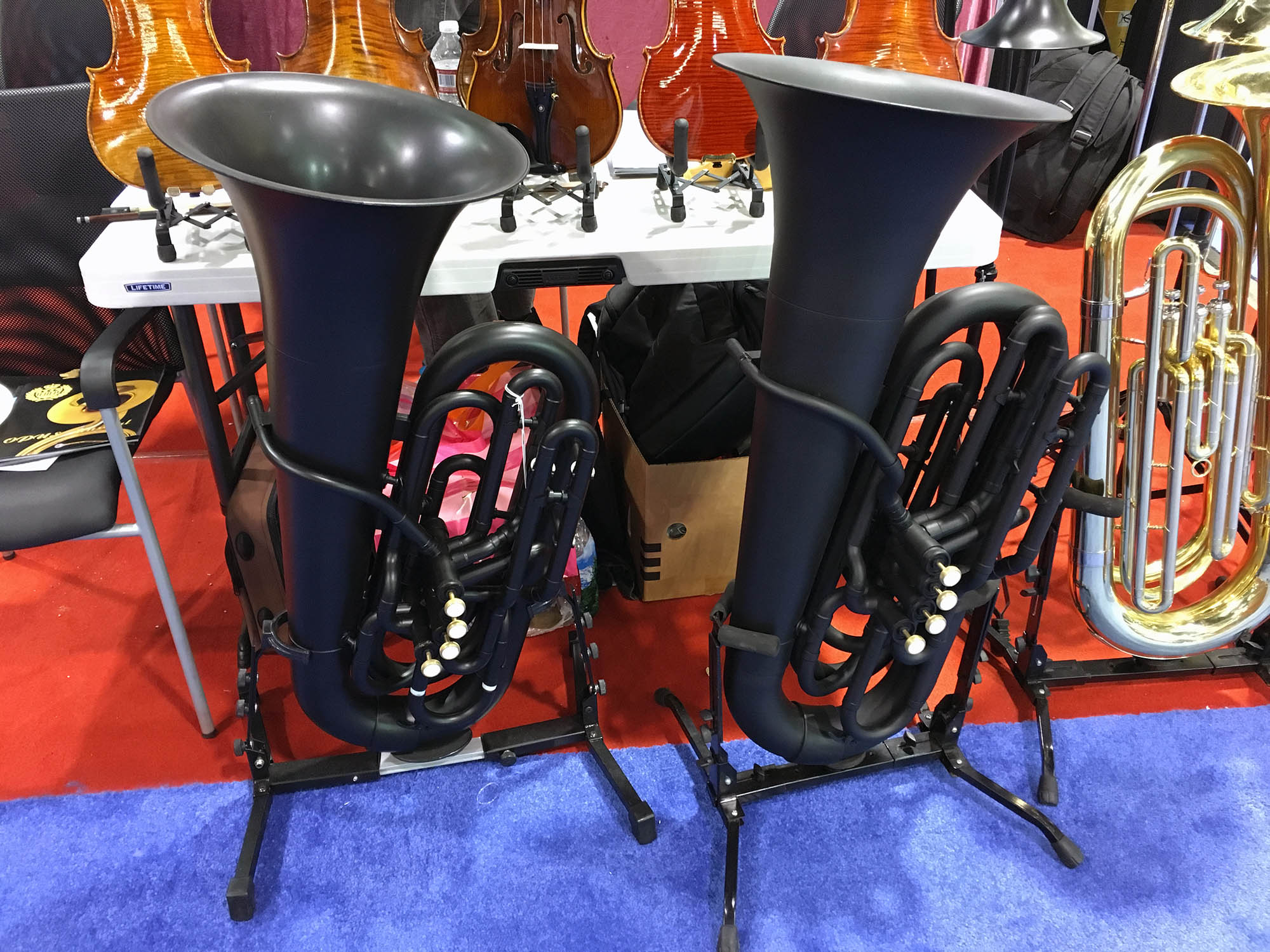 | Every year there are more plastic instruments. I showed a plastic tuba in my blog last year. This one, by Opus Instruments, is much better. It still had a dull response, but I could play all the notes pretty well in tune. The big advantage is that it is very light. |