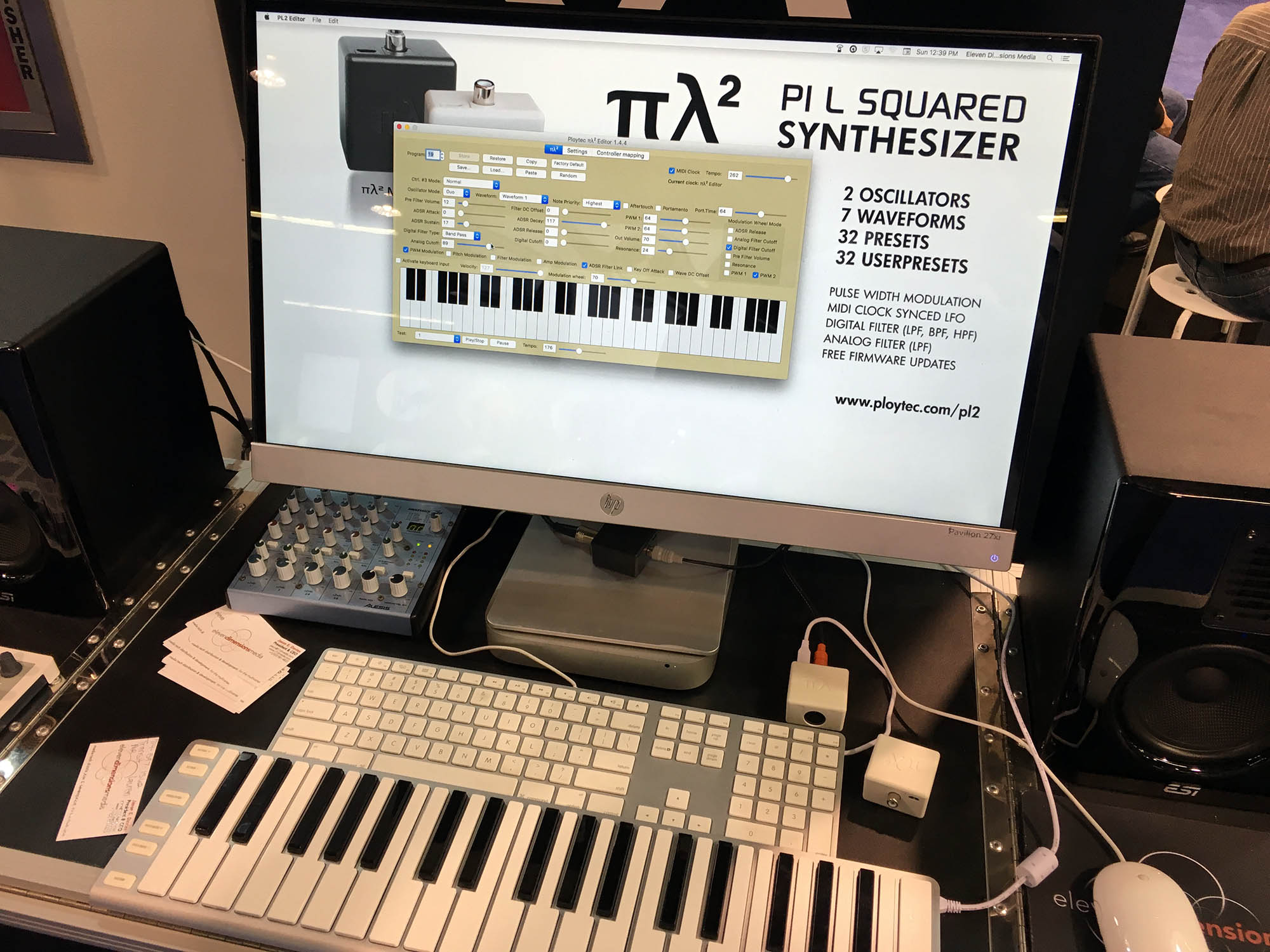 | Ploytec is selling a hardware duophonic analog synthesizer - but its only about an inch cubed and weighs less than my pet cockatiel. There are two of these Pi L Squared (They use Greek letters for Pi and Lambda) synths in this photo - just to the top right of the computer keyboard. These are also very inexpensive. |