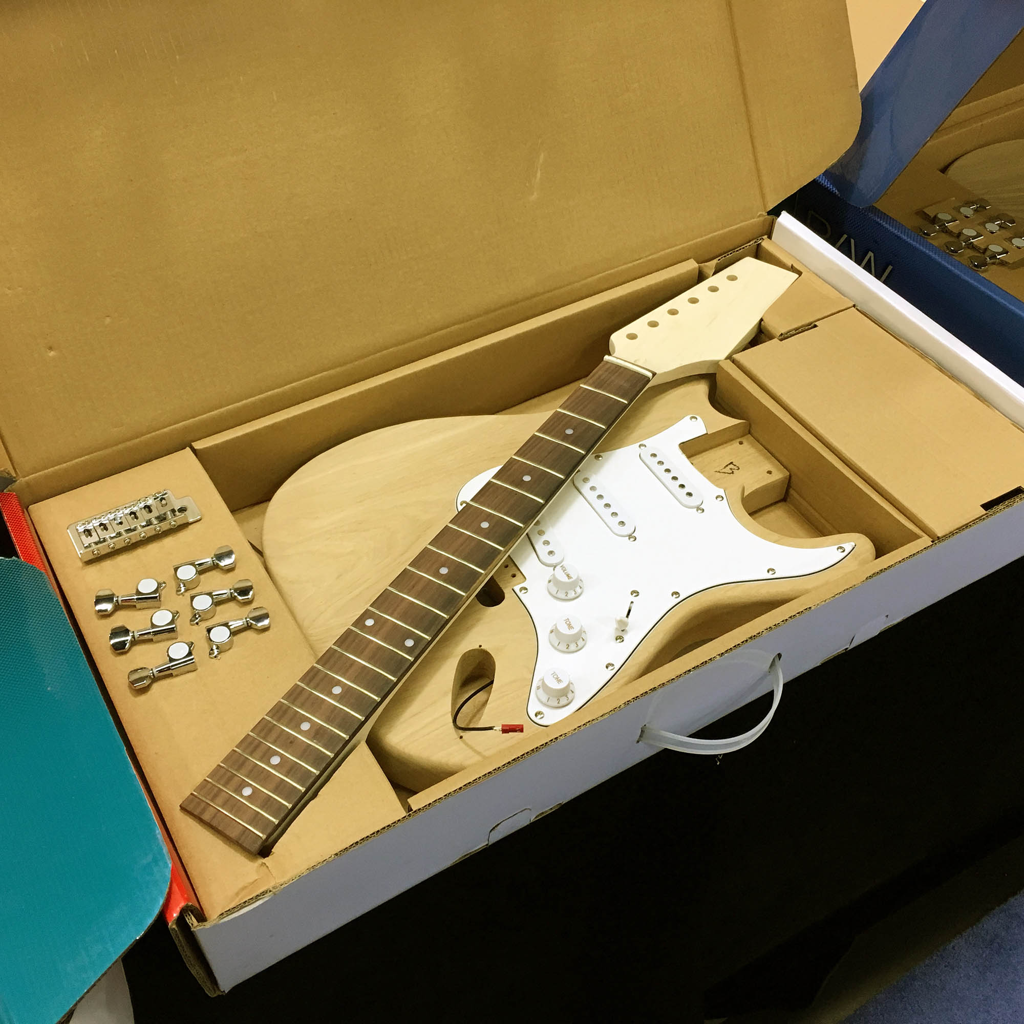 | Remember when you could buy many musical instruments as kits? My large home theater organ began life as one of those kits in the 1960s. Some kits are back again. According to the folks at the RAWKits booth, they are gaining quickly in popularity. Here is one of their electric guitar kits - all boxed and ready to be assembled. |