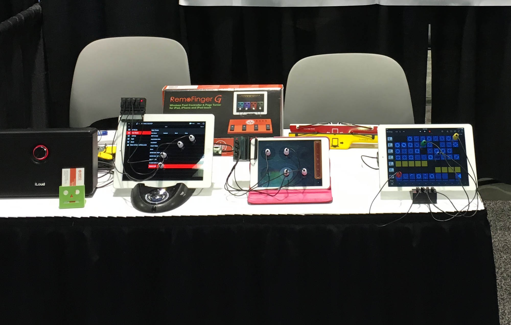 | This is a great idea with many applications. This company, called Remo Fingers, makes small wires with suction cups on the connectors. You stick them on a mobile device in a spot where you would use you finger to clock a control. The connector has a transducer that mimics the capacitance change of your finder. In this way, you can set up foot switches (or lots of other things) to trigger anything your finger can. They were pushing these a page turners for PDF viewers - but I think this kind of thing will find lots of other uses. |