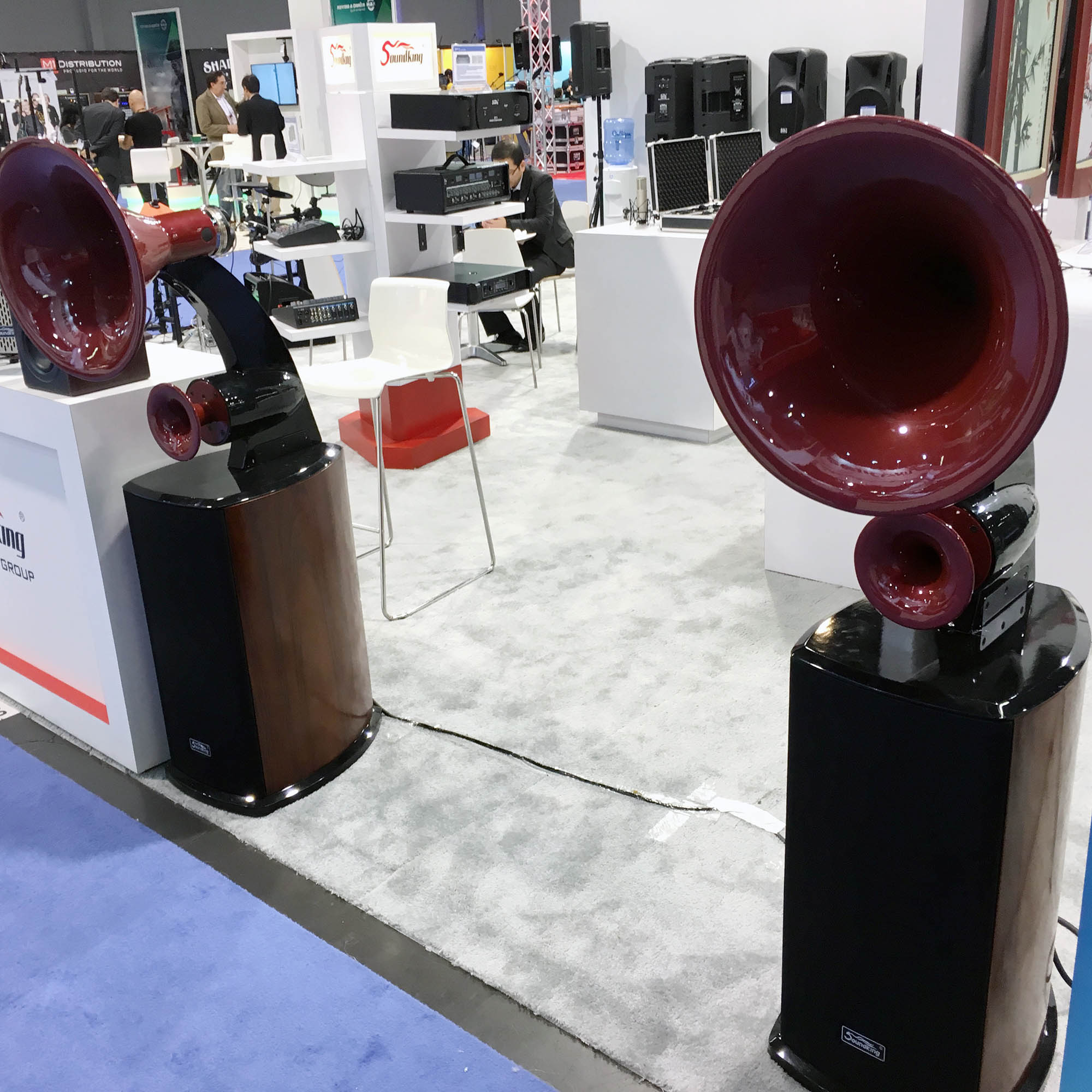 | Sound King displayed these monstrous-looking speaker enclosures at the entrance to their booth. |