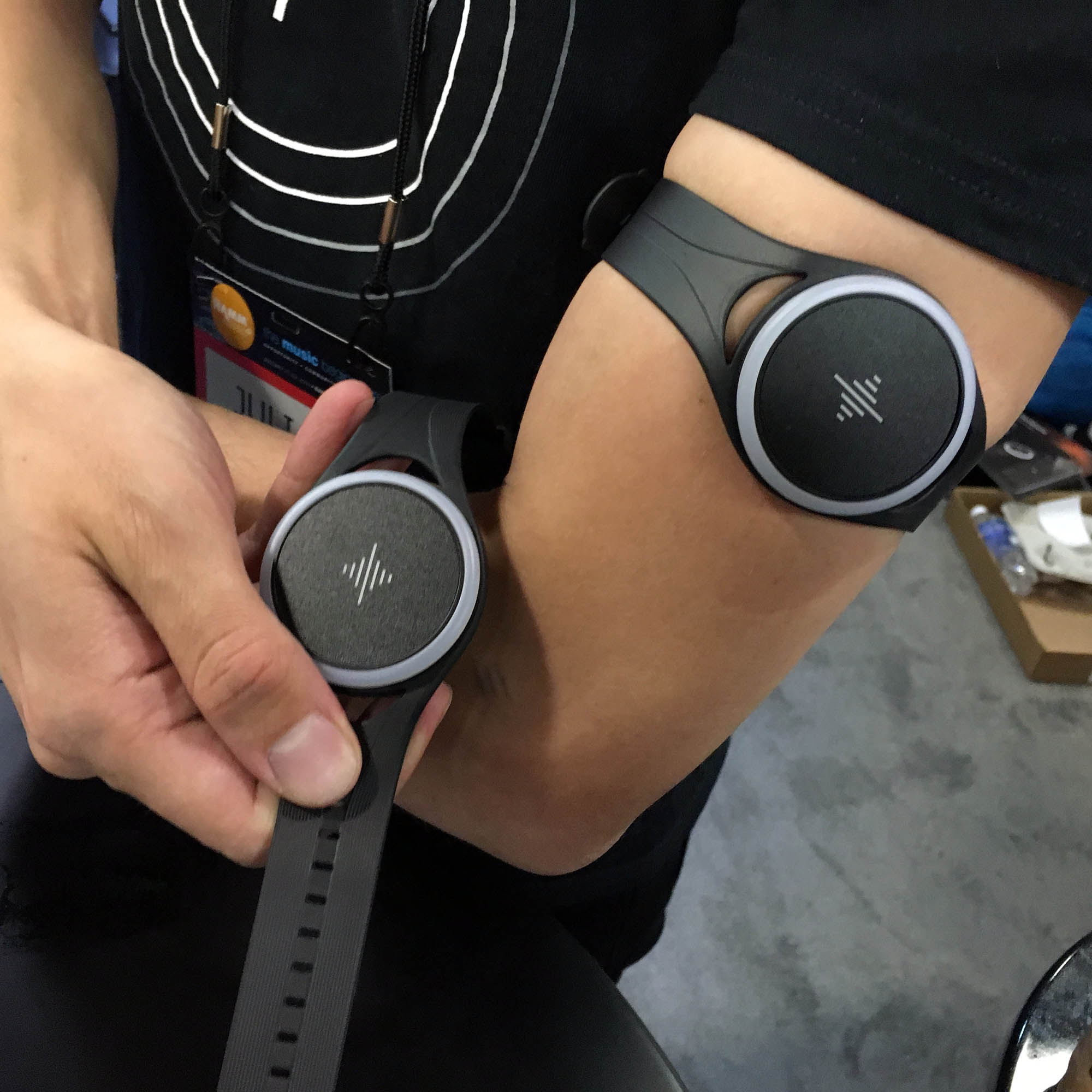 | Soundbrenner was showing what it called "the first wearable device for musicians." It is not a musical instrument, however. It is a metronome. The wearable metronome, called the "Pulse," vibrates and flashes lights to indicate tempo. It can also make a sound - but this can be silenced for performances or recording sessions. You can control it from a mobile app or tap the tempo on the watch face. The most clever part is that if you own several, they can be synchronized in a local network. In this way all musicians at a recording session can use these instead of a click track. |