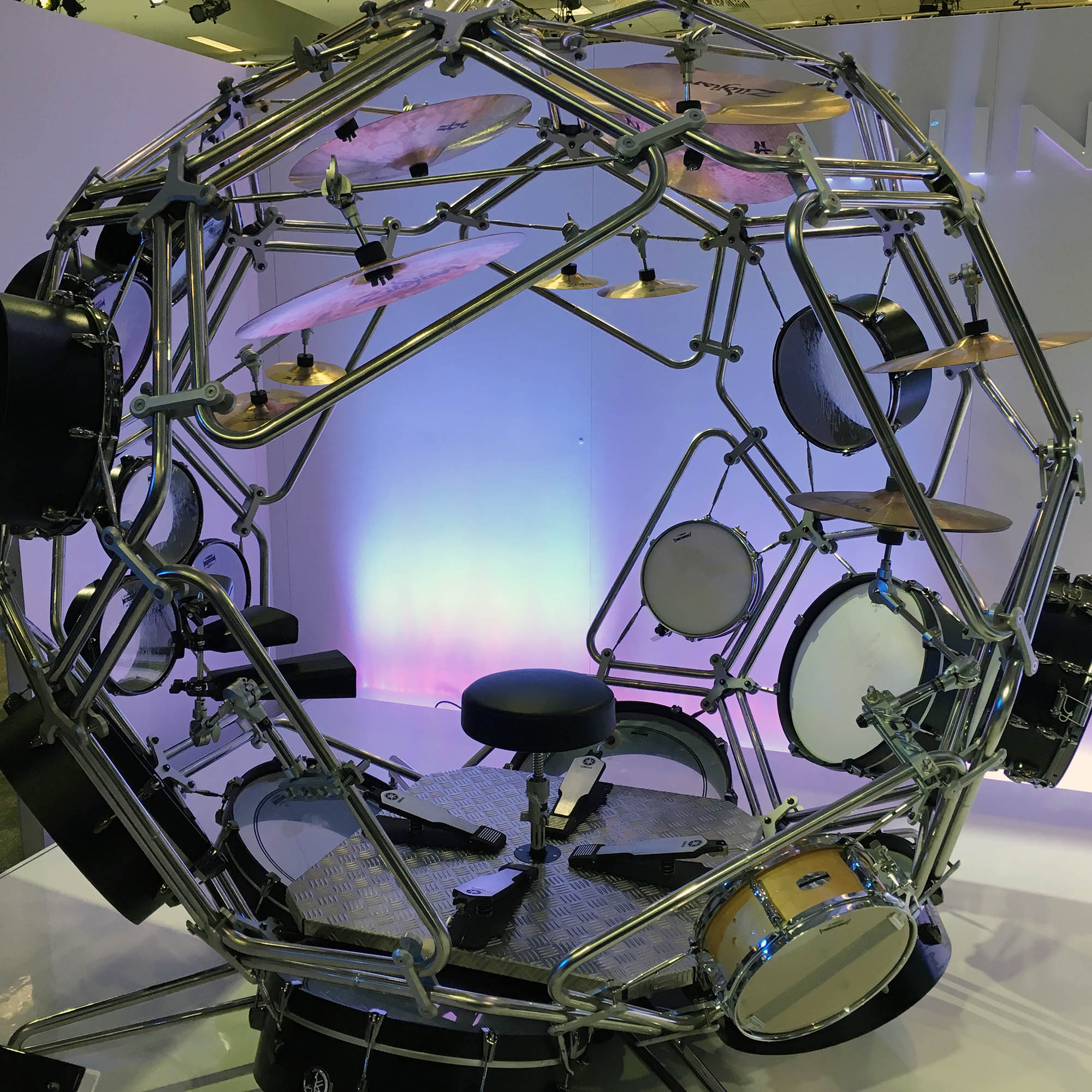 | Yamaha had a display of music-inspired sculpture in their huge exhibit. This is an interesting drum kit. It is not meant to be playable. |