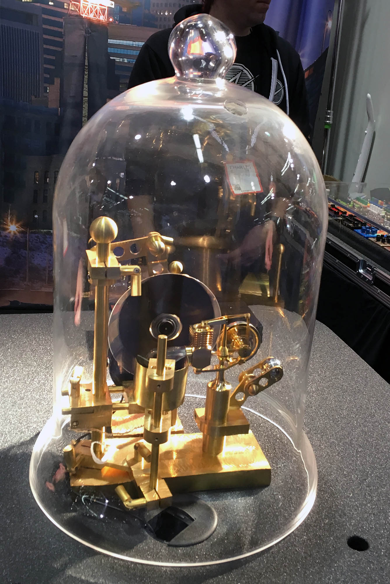 | ZVEX was showing this at their booth. It is billed as the world's first candle-powered effects box. It is truly remarkable. A small candle provides light to a set of solar cells. The electricity powers a small Sterling engine. The speed of the engine can be controlled by moving a dynamic braking device (a magnet) in near a flywheel. The engine turns a disk that has an offset opaque circle on it. The circle modulates a photo-detector which provides the phaser effect (its actually more of a tremolo) for a guitar (or anything else) that is played through it. |
